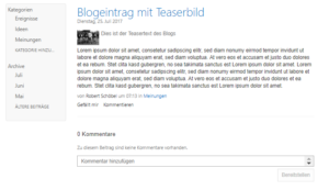 Nach dem Speichern der Seite, sollte die Darstellung für die Gesamtübersicht aller Blogbeiträge nun mit Teaserbild und Teasertext passen.