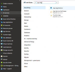 Als erstes öffnet man den Link zu „All Services“ und sucht nach „App-Registration„